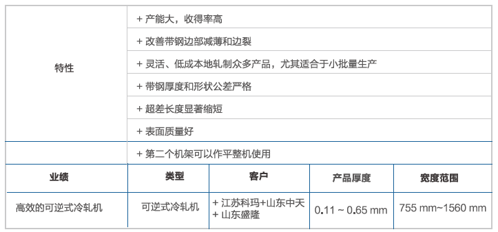 安泰科技雙機(jī)架可逆式冷軋機(jī)集單機(jī)架可逆式軋機(jī)的靈活性和傳統(tǒng)串列式冷軋機(jī)的高產(chǎn)能于一身,但投資成本顯著降低。雙機(jī)架可逆式冷軋機(jī)生產(chǎn)出的產(chǎn)品適合于眾多應(yīng)用,質(zhì)量和產(chǎn)能均達(dá)到出色的水平。雙機(jī)架可逆式冷軋機(jī)對(duì)于薄規(guī)格產(chǎn)品的軋制能力可以達(dá)到300,000t/a,而厚規(guī)格產(chǎn)品可以達(dá)到1,000,000t/a甚至更高。